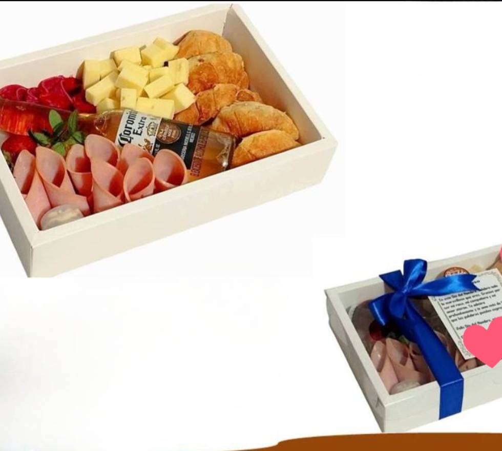 Caja de cartón procesado, cinta decorativa, tarjeta, mixtura de quesos y carnes maduradas (pueden variar según disponibilidad), dip de queso, mini croissant y una cerveza coronita.