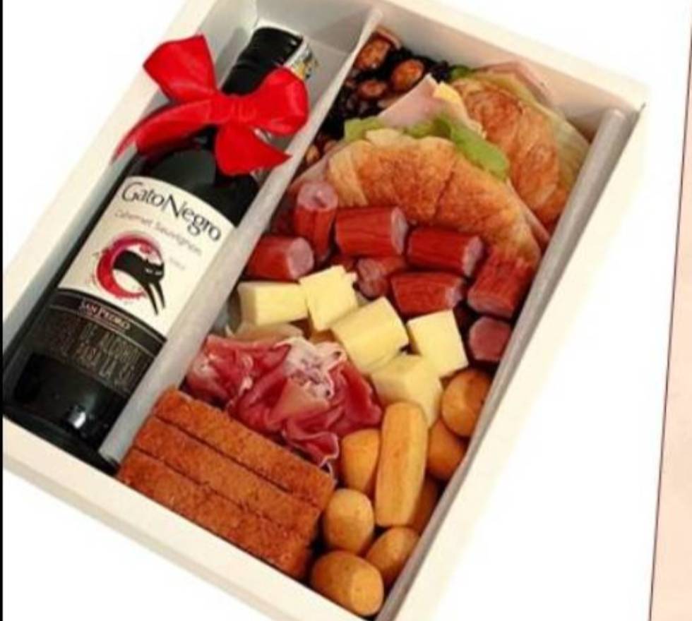 Caja de cartón procesado con tapa estampada "Feliz Día", tarjeta, botella de vino Gato Negro tinto, mix de quesos, maduros y mini croissant con lechuga, lonchita, jamón y pesto.