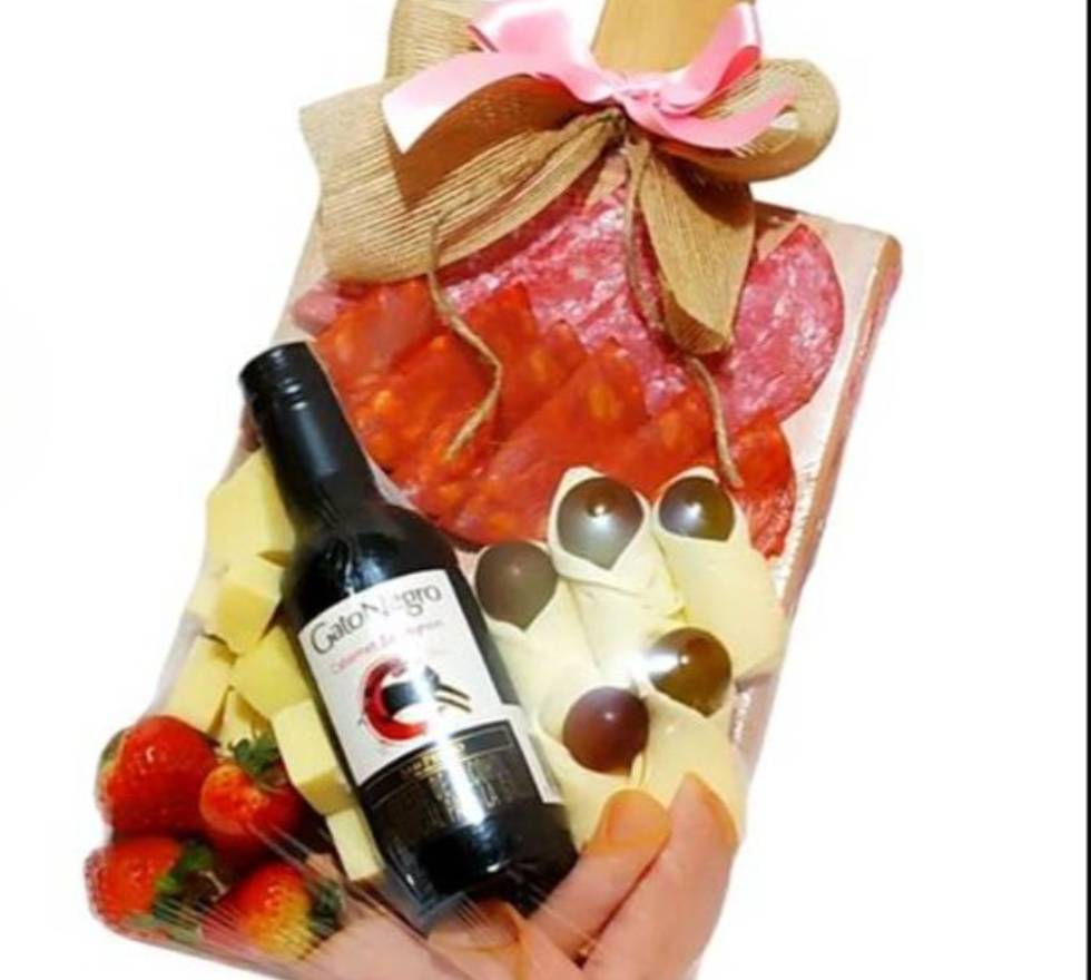 Tabla de madera, mixtura de quesos y carnes maduradas (puede variar según disponibilidad), piba de vino tinto gato negro, tarjeta y cinta decorativa.