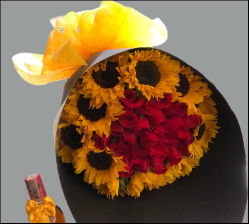 Además, puedes acompañar este bouquet de girasoles y rosas con una botella de licor, como vino, champagne, whisky o cualquier licor que prefieras. El licor elegido será el toque perfecto para hacer de tu regalo una experiencia completa y sofisticada, ideal para brindar en momentos especiales y compartir una celebración memorable.