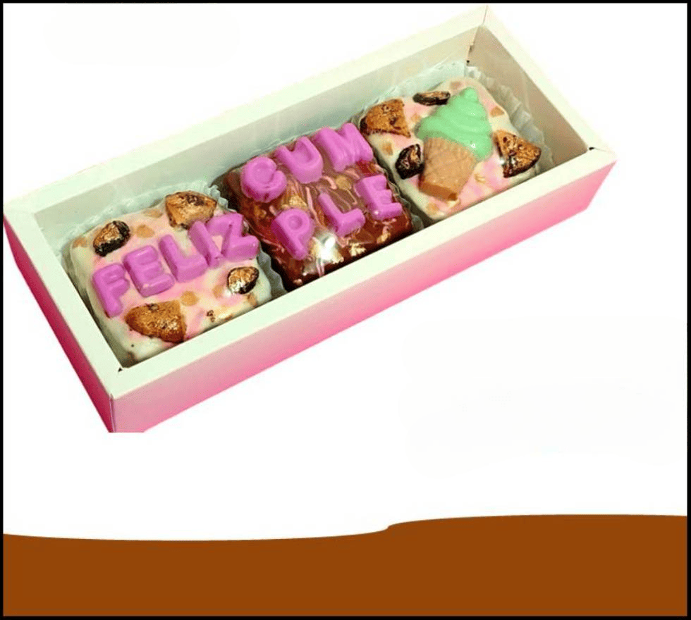 Caja de cartón procesado con tapa de acetato, cinta decorativa, tarjeta y 3 brownies rellenos de arequipe decorados con chocolate y personalizados.
