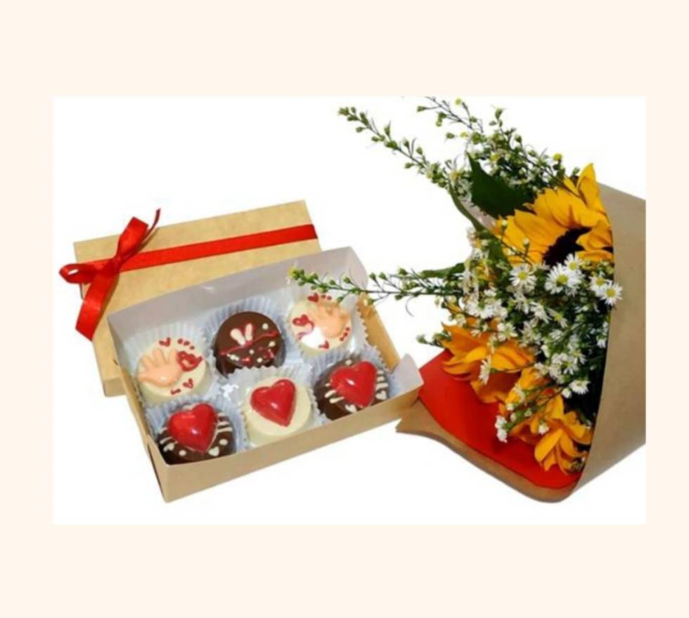 Caja de cartón, cinta decorativa, tarjeta, 6 trufas de brownie cubiertas de chocolate personalizadas y un bouquet de 3 girasoles con follaje.