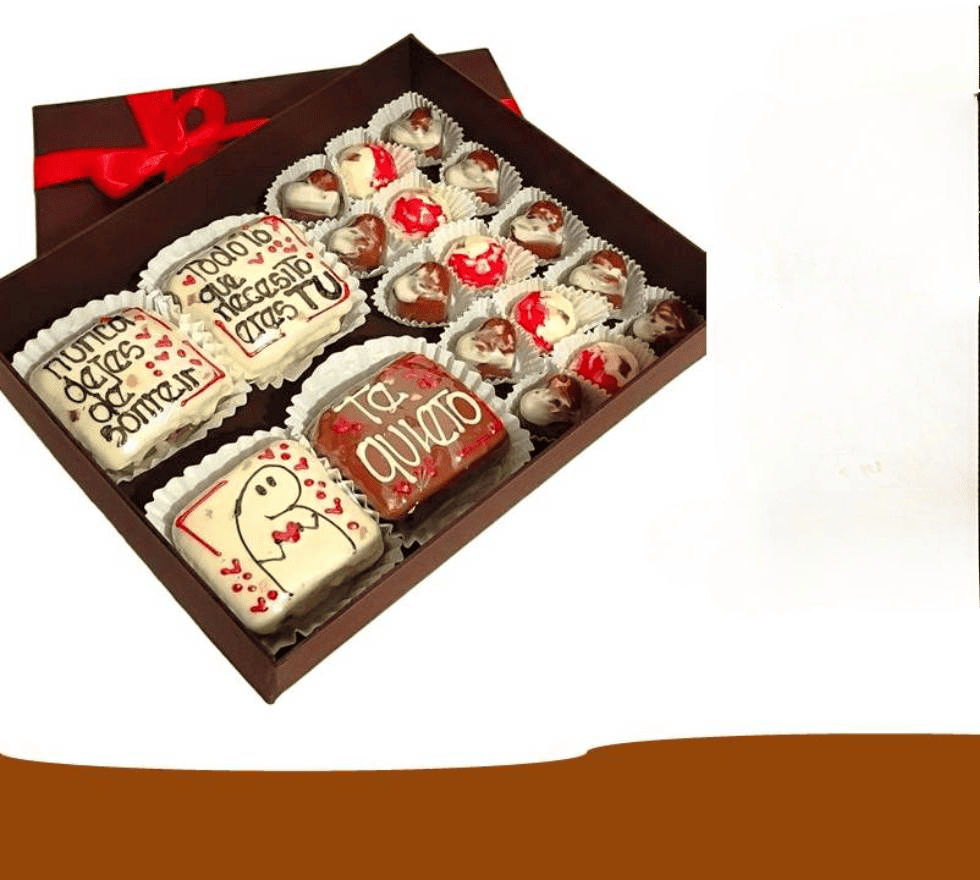 Caja de cartón blanca con tapa de acetato (no disponible en caja negra), cinta decorativa, tarjeta, 4 brownies rellenos de arequipe cubiertos de chocolate personalizados, 10 bombones en forma de corazón en chocolate café con relleno surtido y 5 bombones de chocolate rombo en chocolate blanco con relleno surtido.