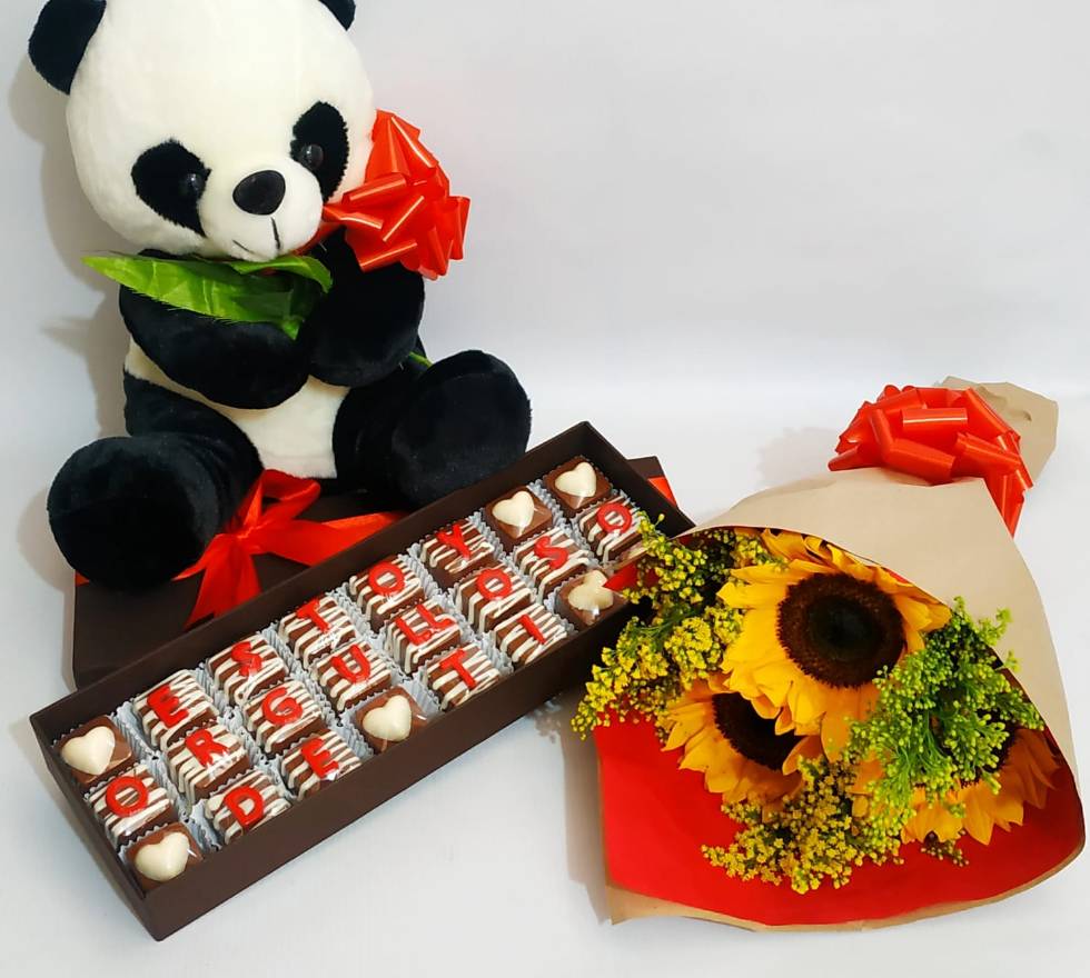 Caja de cartón, moño, tarjeta, 24 bombones de de chocolate con texto personalizado, peluche según disponibilidad y bouquet de 3 girasoles con follaje.