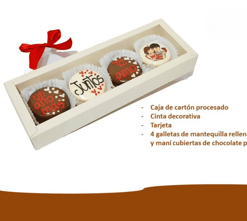 Caja de cartón procesado, cinta decorativa, tarjeta y 4 galletas de mantequilla rellenas de nutella y maní cubiertas de chocolate personalizadas.