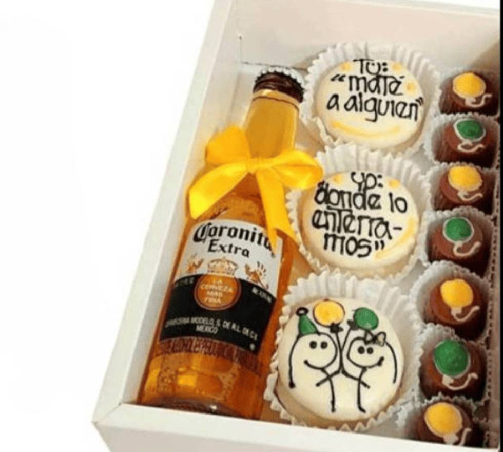 Caja de cartón con tapa en acetato, moño, tarjeta, una cerveza coronita, tres galletas rellenas de nutella y maní cubiertas de chocolate personalizadas y siete bombones de chocolate con relleno surtido.