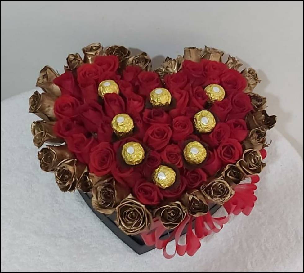 Este hermoso arreglo en forma de corazón está diseñado para expresar amor y elegancia. Con rosas doradas bordeando la caja, simbolizando lujo y admiración, y rosas rojas en el centro, que representan pasión y amor eterno, este detalle floral es perfecto para cualquier ocasión especial.