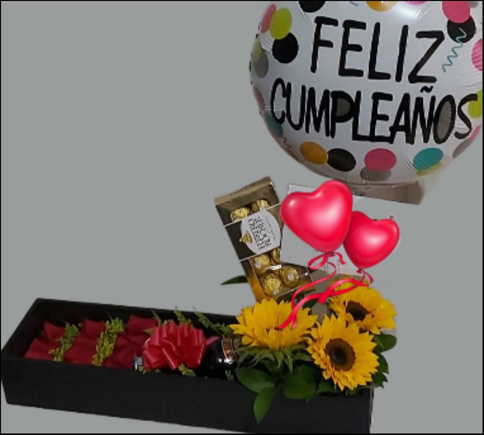 Este espectacular arreglo combina 12 rosas frescas, 3 girasoles vibrantes, una caja de 8 chocolates Ferrero, un globo festivo y media botella de Baileys, creando el regalo perfecto para cualquier ocasión especial. Las rosas y girasoles aportan belleza y alegría, mientras que los chocolates Ferrero añaden un toque dulce y sofisticado. El globo y el Baileys completan este detalle único, ideal para celebraciones como aniversarios, cumpleaños o momentos especiales. Si deseas enviar este obsequio de manera aún más especial, ofrecemos flores a domicilio en Medellín, para que tu regalo llegue directamente a la puerta de esa persona especial. Un regalo completo, lleno de cariño, elegancia y dulzura, que sorprenderá a quien lo reciba.