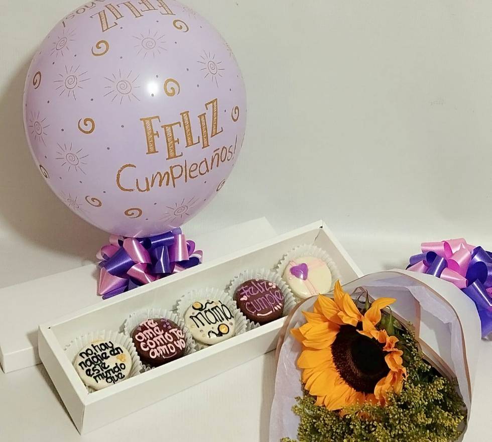 Caja de cartón, moño, globo, tarjeta, 5 galletas de mantequilla rellenas de nutella y maní cubiertas de chocolate personalizadas, 1 un girasol en bouquet con follaje.