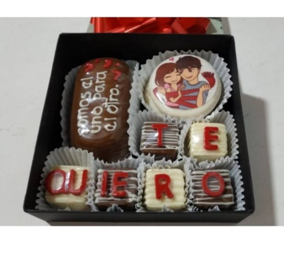 Caja de cartón industrial forrada, cinta decorativa, tarjeta, 6 bombones de chocolate con relleno surtido decorados con mensaje personalizado, 1 galleta de mantequilla rellena de nutella y maní cubierta de chocolate personalizada y 1 paleta de chocolate café rellena de trufa de brownie y arequipe personalizada.