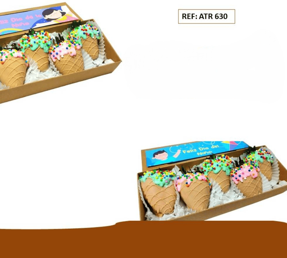 Un detalle elegante y lleno de sabor para celebrar a los pequeños con un toque especial. Presentado en una caja de cartón kraft decorada con temática infantil, incluye una tarjeta personalizada y 5 fresas tipo A cubiertas de chocolate, decoradas en forma de adorables conitos que combinan dulzura y diversión.