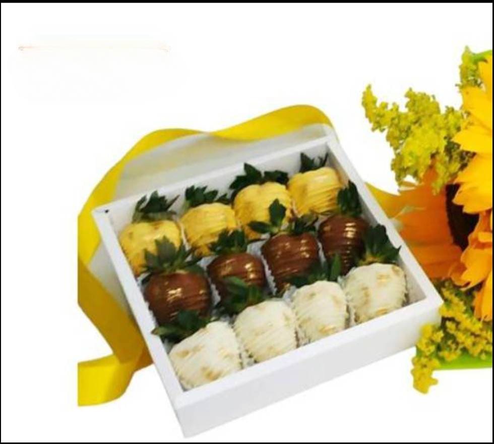 Caja de cartón procesado con tapa en acetato, cinta decorativa, tarjeta, 12 fresas cubiertas con chocolate decoradas.