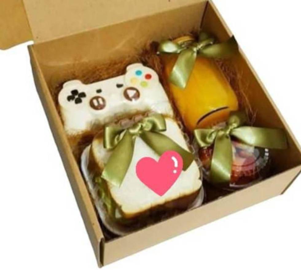 Caja de cartón, cinta decorativa, tarjeta, fibra de coco decorativa, jugo de naranja, fruta picada, sándwich, control de chocolate blanco relleno de brownie, mermelada de mora y M&M's.