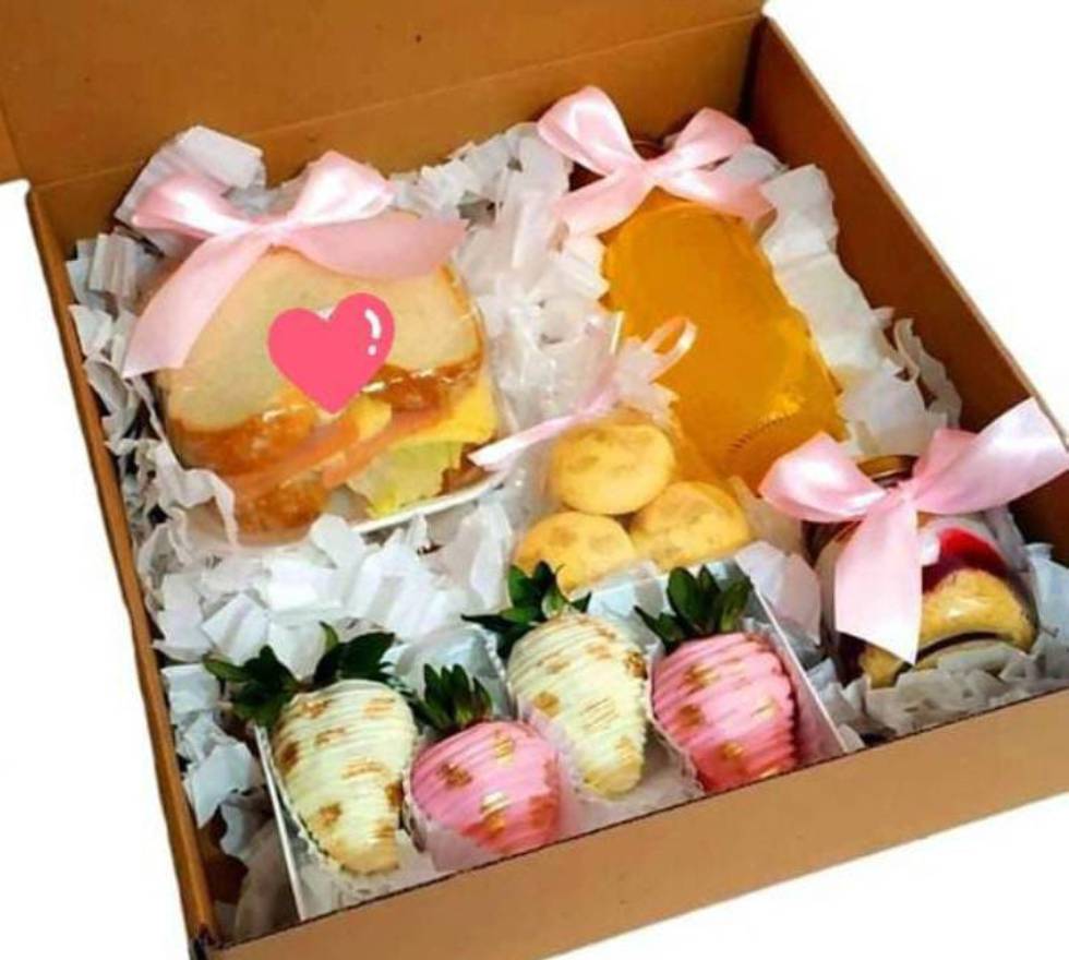 Caja de cartón, cinta decorativa, tarjeta, papel picado, sándwich, jugo de naranja, tres alfajores de maicena (puede variar según disponibilidad), una caja con 4 o 5 fresas tipo A cubiertas de chocolate (la cantidad varía según el tamaño) y mini postre.