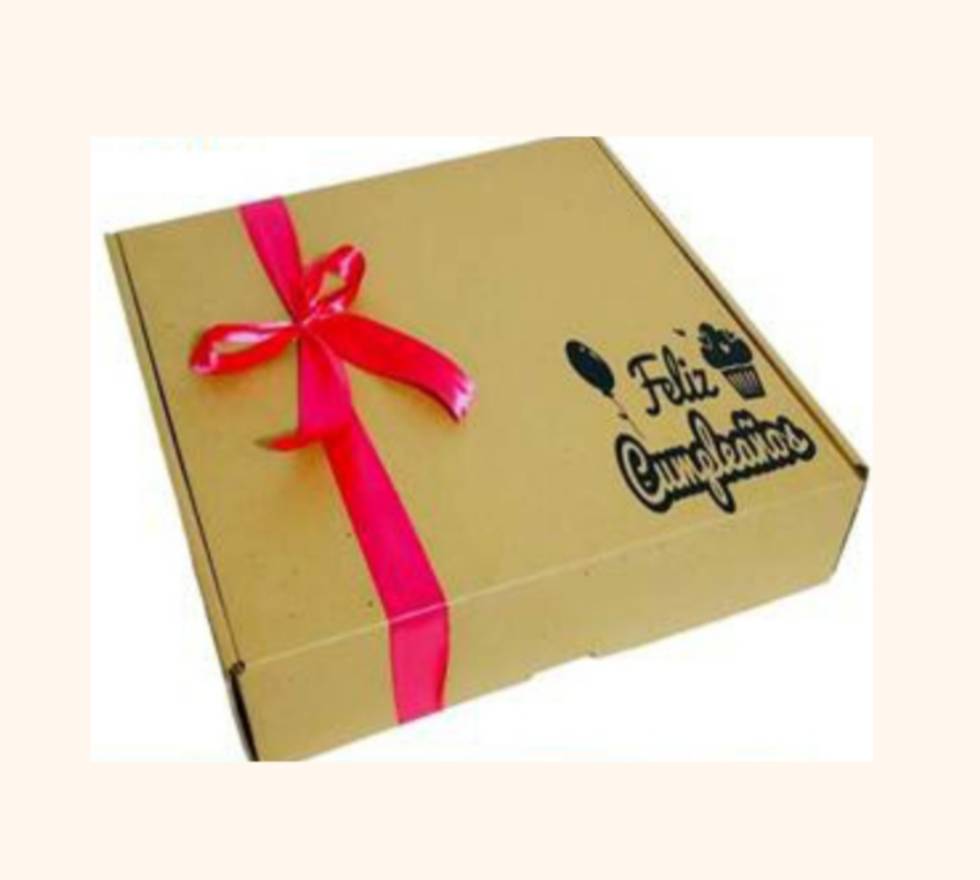 Caja de cartón, cinta decorativa, tarjeta, papel picado, vinilo decorativo, sandwich, pancakes con miel de maple y fresa picada, jugo de naranja y galleta de mantequilla rellena de nutella y maní cubierta de chocolate personalizada.
