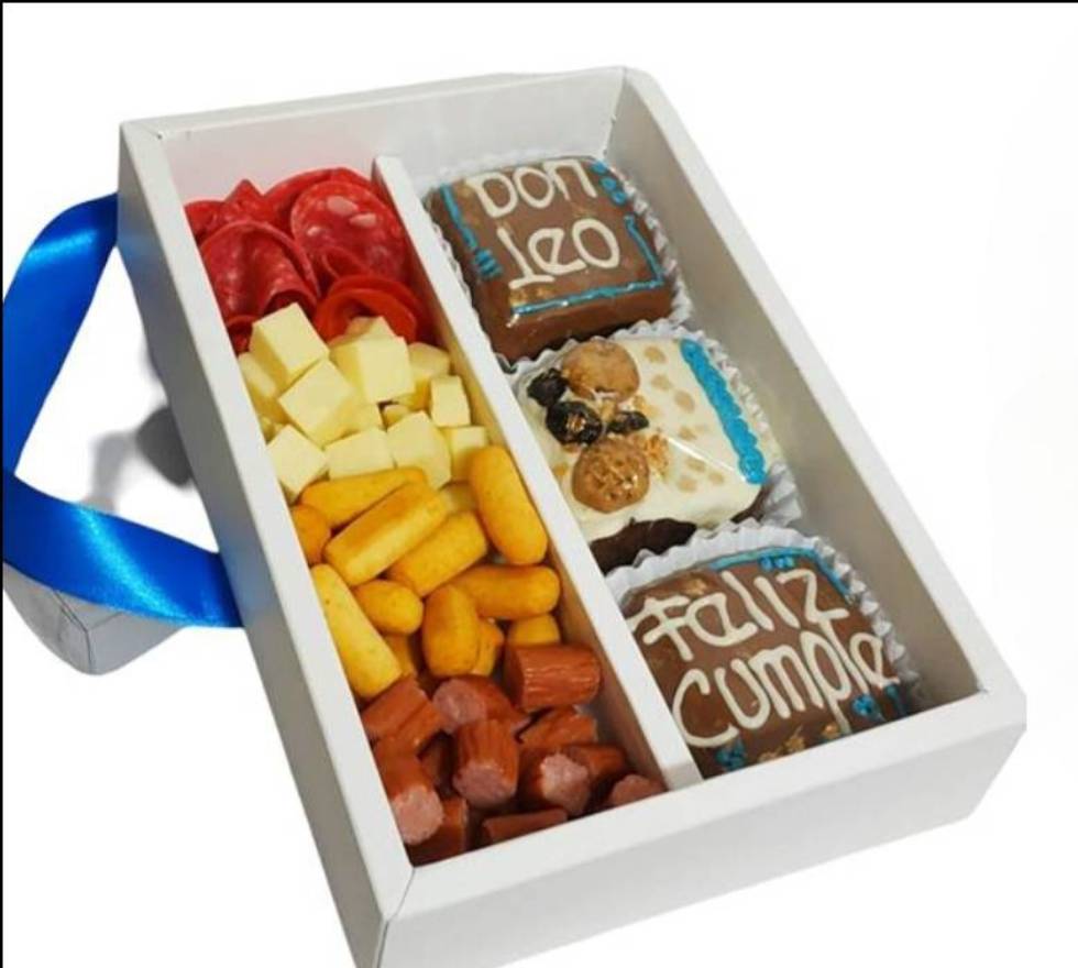 Caja de cartón procesado con tapa en acetato, cinta decorativa, tarjeta, mixtura de quesos y maduros (puede variar según disponibilidad) y tres brownies rellenos de arequipe cubiertos de chocolate personalizados.