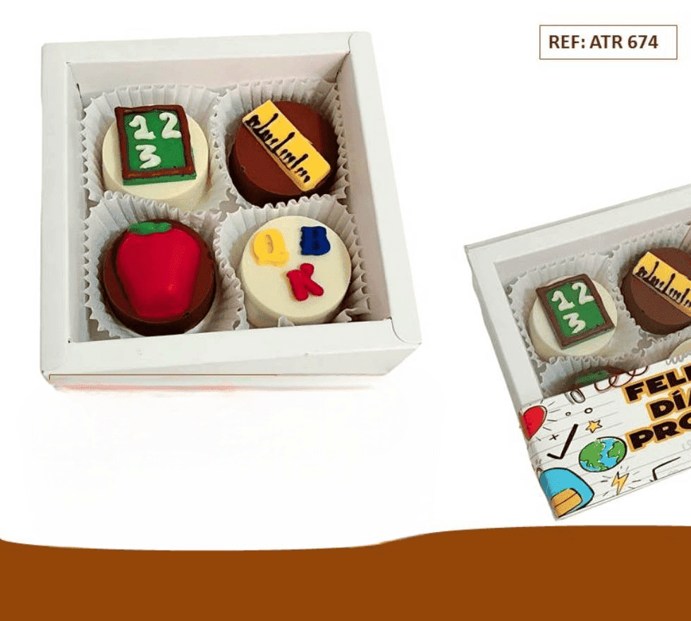 Haz del Día del Profesor un momento inolvidable con este detalle personalizado. La caja de cartón con tapa de acetato, cuidadosamente decorada, es perfecta para mostrar tu aprecio. Dentro, encontrarás cuatro trufas de brownie, elaboradas con todo el cariño y personalizadas según la temática que elijas, haciendo de este regalo algo único y especial.