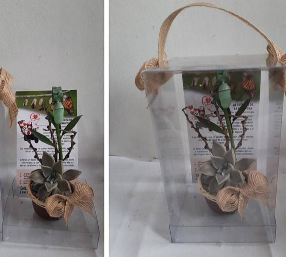 La mini suculenta, reconocida por su resistencia y belleza sencilla, representa la fortaleza que habita en quienes continúan adelante a pesar del dolor. A su lado, la crisálida nos recuerda el proceso natural de transformación, un renacer silencioso que ocurre después de la pérdida.