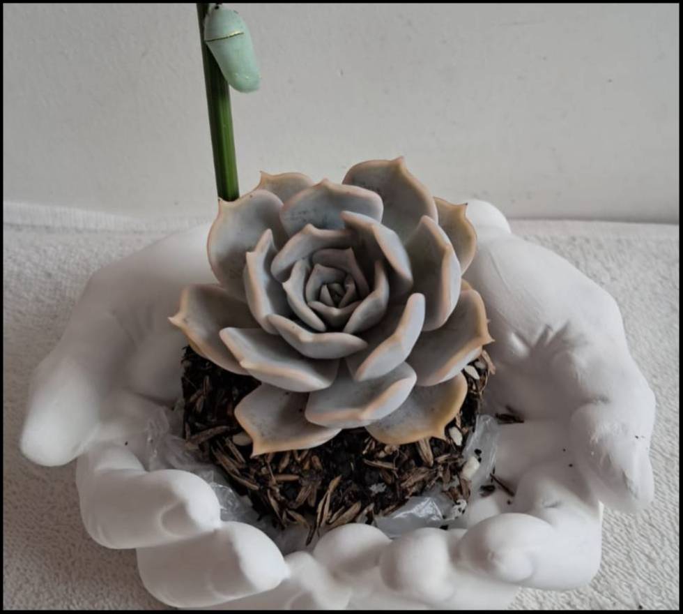 El diseño presenta unas manos entrelazadas, que representan el apoyo constante y el abrazo protector que envuelven a quien lo necesita. Dentro de estas manos, descansa una suculenta, símbolo de resistencia y crecimiento, que refleja la fuerza para seguir adelante incluso en los momentos más difíciles. La crisálida, ubicada suavemente junto a la planta, es un recordatorio de la metamorfosis y la renovación, invitando a encontrar esperanza en medio del duelo.