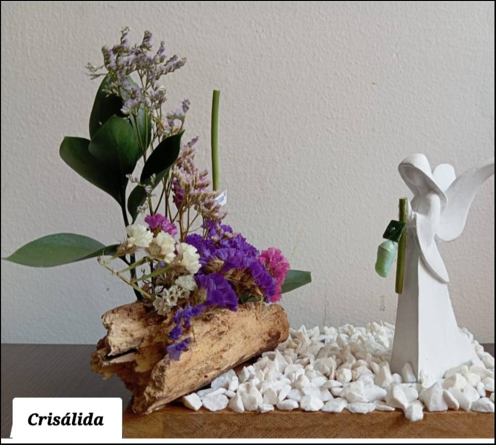 La figura central es un pequeño ángel de marmolina, que aporta serenidad y protección. El ángel se encuentra sobre una base de piedras decorativas, las cuales aportan solidez y elegancia al conjunto. El tronco, adornado con flores secas de colores, resalta la conexión con la naturaleza y la eternidad, mientras que la crisálida simboliza la transición hacia un nuevo comienzo, un recordatorio de que la vida continúa más allá de la despedida.