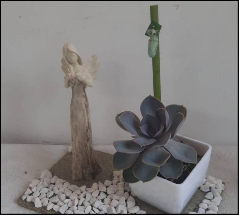 La crisálida, colocada cuidadosamente en el conjunto, nos recuerda el proceso de transformación y renacimiento. Es un símbolo poderoso que invita a encontrar esperanza en medio del duelo y a confiar en que, tras el dolor, llega la renovación.