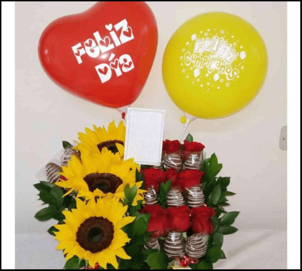 Caja de madera, 11 fresas cubiertas con chocolate decoradas, 3 girasoles con follaje, dos globos según la ocasión, 9 rosas naturales y tarjeta.