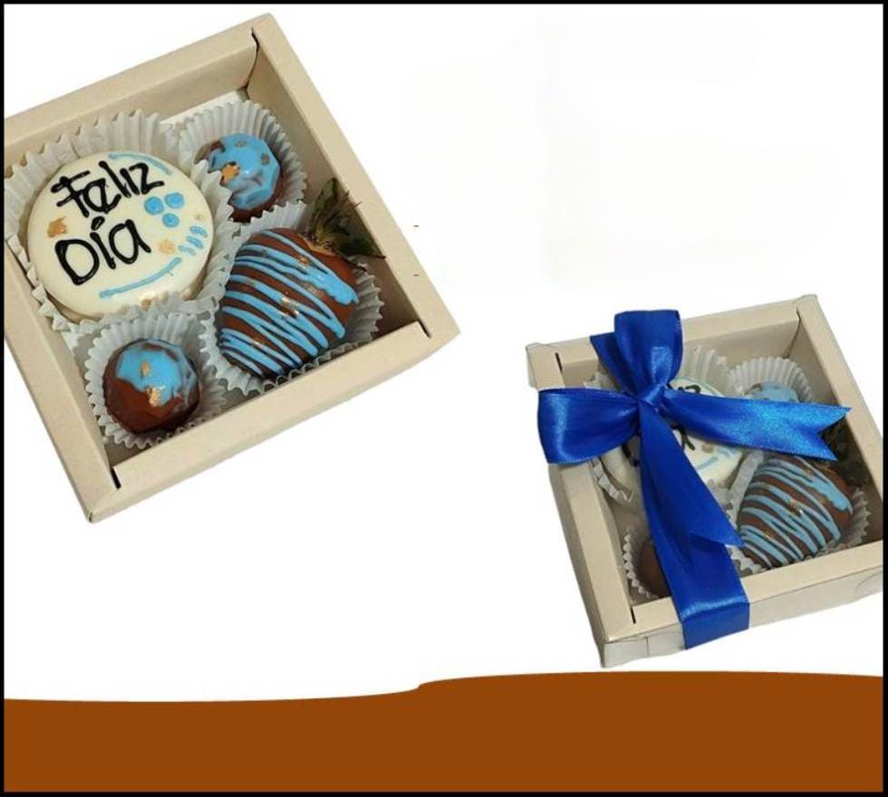 Caja de cartón kraft con tapa en acetato, cinta decorativa, mensaje, una fresa cubierta de chocolate decorada, dos bombones de chocolate café en forma de corazón con relleno surtido y una galleta de mantequilla rellena de nutella y maní cubierta de chocolate personalizada.