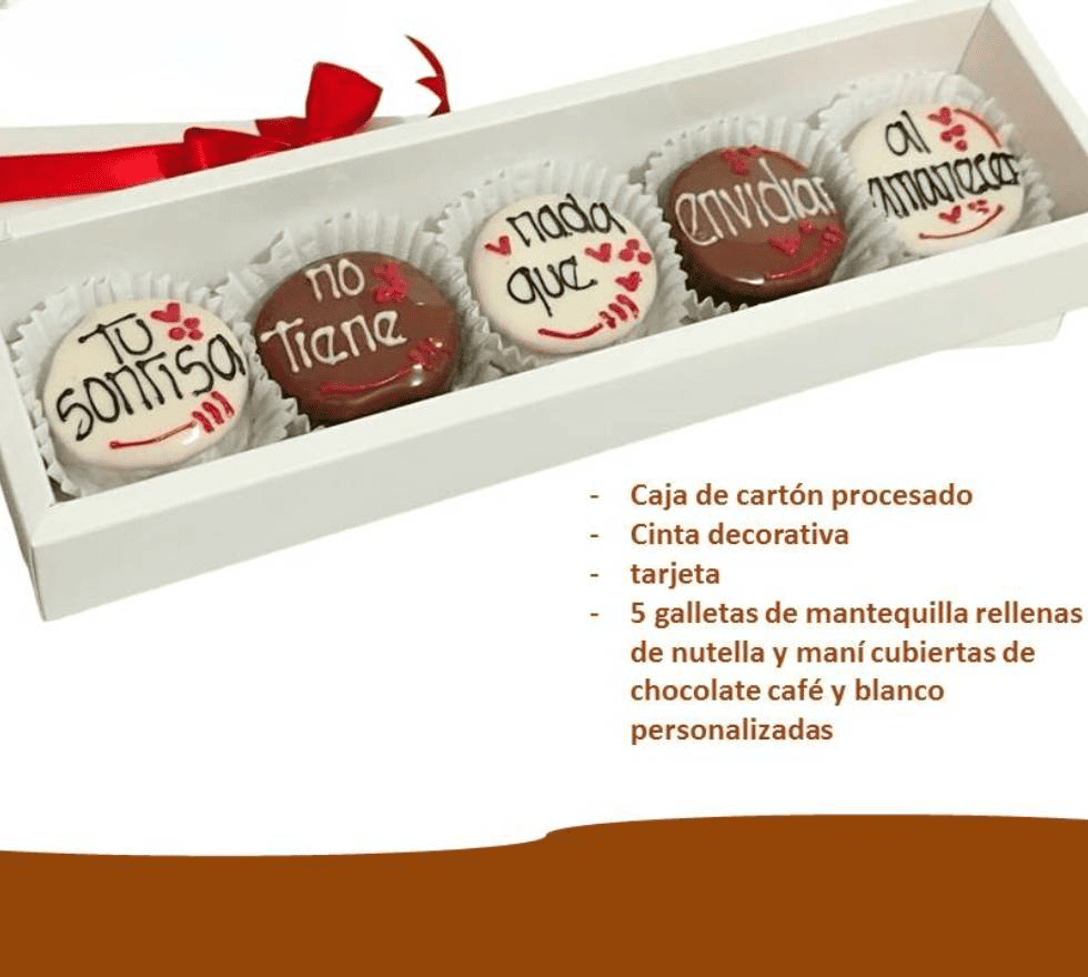 Caja de cartón procesado, cinta decorativa, tarjeta y 5 galletas de mantequilla rellenas de nutella y maní cubiertas de chocolate personalizadas.