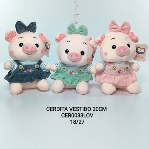 Este tierno peluche de cerdita mide 20 cm y es pura dulzura. Su cuerpo es de un suave color rosa claro, con una textura esponjosa que invita a abrazarla. Lleva un adorable vestido rosado con detalles delicados que resaltan su encanto. La cerdita tiene un moño grande en la cabeza, también de color rosado, que le da un toque extra de ternura. Sus ojitos brillantes y su pequeña naricita redonda completan su cara, dándole una expresión simpática y amigable. Es perfecta para regalar en ocasiones especiales o para quienes adoran a los animales adorables.
