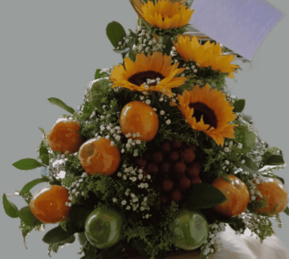 Ramo de frutas, ramo con frutas, ramo de girasoles con frutas, frutas, ancheta con frutas, ancheta con flores y frutas, girasoles y frutas, frutas, flores, regalos a domicilio en medellín, detalles a domicilio en medellín