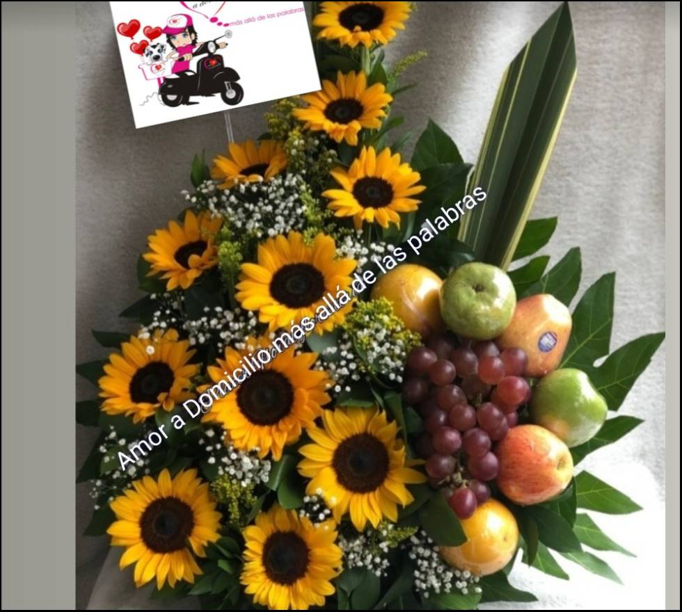 Sorprende con un ramo de girasoles con frutas frescas, una combinación única de flores brillantes y frutas deliciosas. Este ramo está compuesto por girasoles radiantes que aportan energía y alegría, acompañados de una selección de frutas frescas como uvas, manzanas, peras y más. La mezcla de los girasoles con las frutas frescas crea un regalo original y lleno de frescura, ideal para ocasiones especiales como cumpleaños, aniversarios o cualquier momento que merezca ser celebrado.