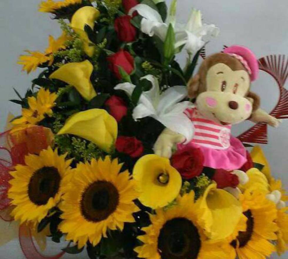 Este espectacular ramo de girasoles combina la alegría de los girasoles, la elegancia de las rosas y la frescura de las orquídeas, creando un arreglo lleno de color. Los girasoles amarillos añaden un toque vibrante, mientras que el peluche suave y tierno completa el detalle con un toque de ternura. Ideal para ocasiones especiales como aniversarios, cumpleaños o para sorprender a esa persona especial, este ramo es un regalo completo que expresa amor, alegría y cariño en cada uno de sus componentes. Si deseas hacer aún más especial este obsequio, ofrecemos regalos a domicilio en Medellín, para que el ramo llegue directamente a la puerta de esa persona especial. Un detalle único que hará de cualquier celebración un momento inolvidable.