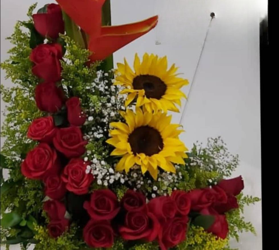 Este vibrante ramo de flores combina la elegancia de las rosas, la calidez de los girasoles y la exótica belleza de la flor del paraíso, creando un arreglo único lleno de frescura y color. Las rosas simbolizan el amor, los girasoles aportan energía y alegría, y la flor del paraíso añade un toque exótico y sofisticado, convirtiendo este ramo en un regalo lleno de significado.