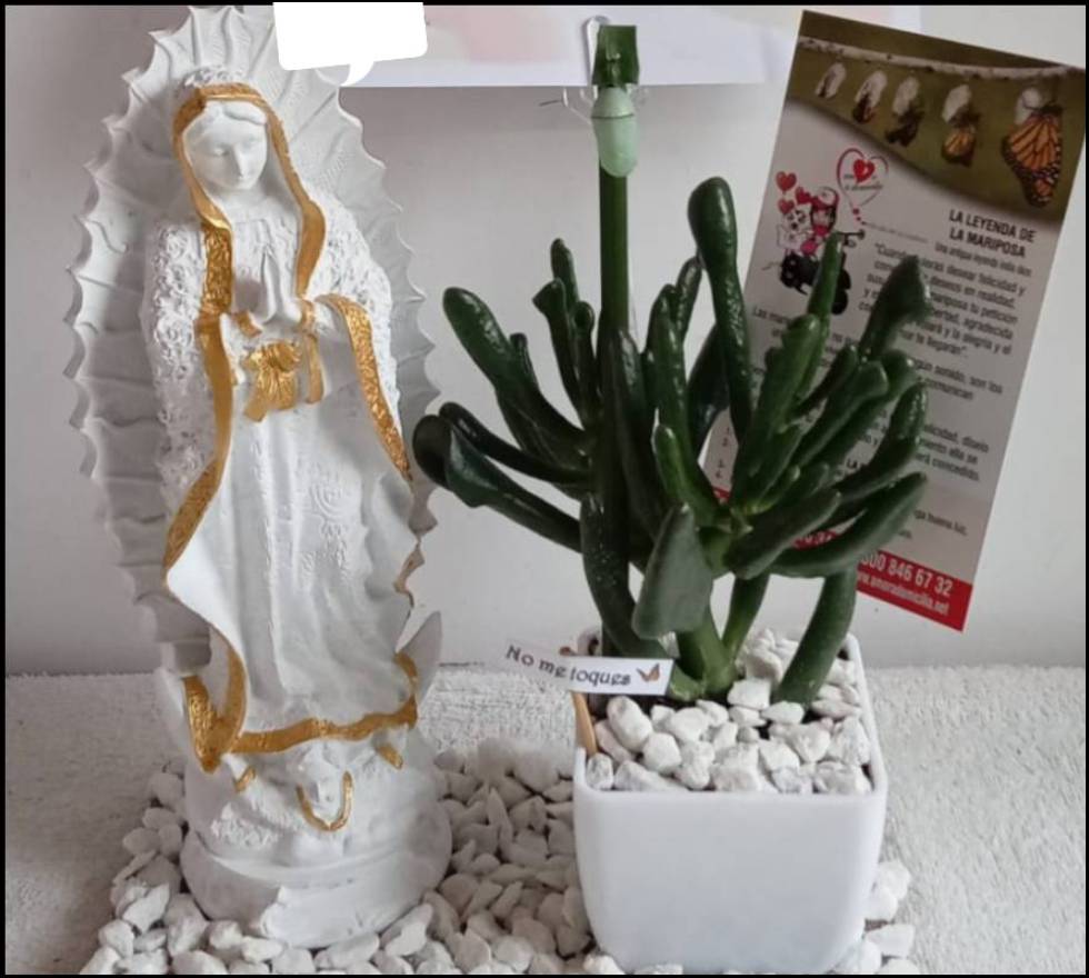 La figura de la Virgen de Guadalupe, emblema de protección y amor maternal, brinda serenidad en tiempos de tristeza, recordándonos que la fe y el amor permanecen, incluso en los momentos más oscuros. A su lado, la suculenta, símbolo de fortaleza y vida, representa la continuidad y el crecimiento que persisten a pesar de la pérdida.