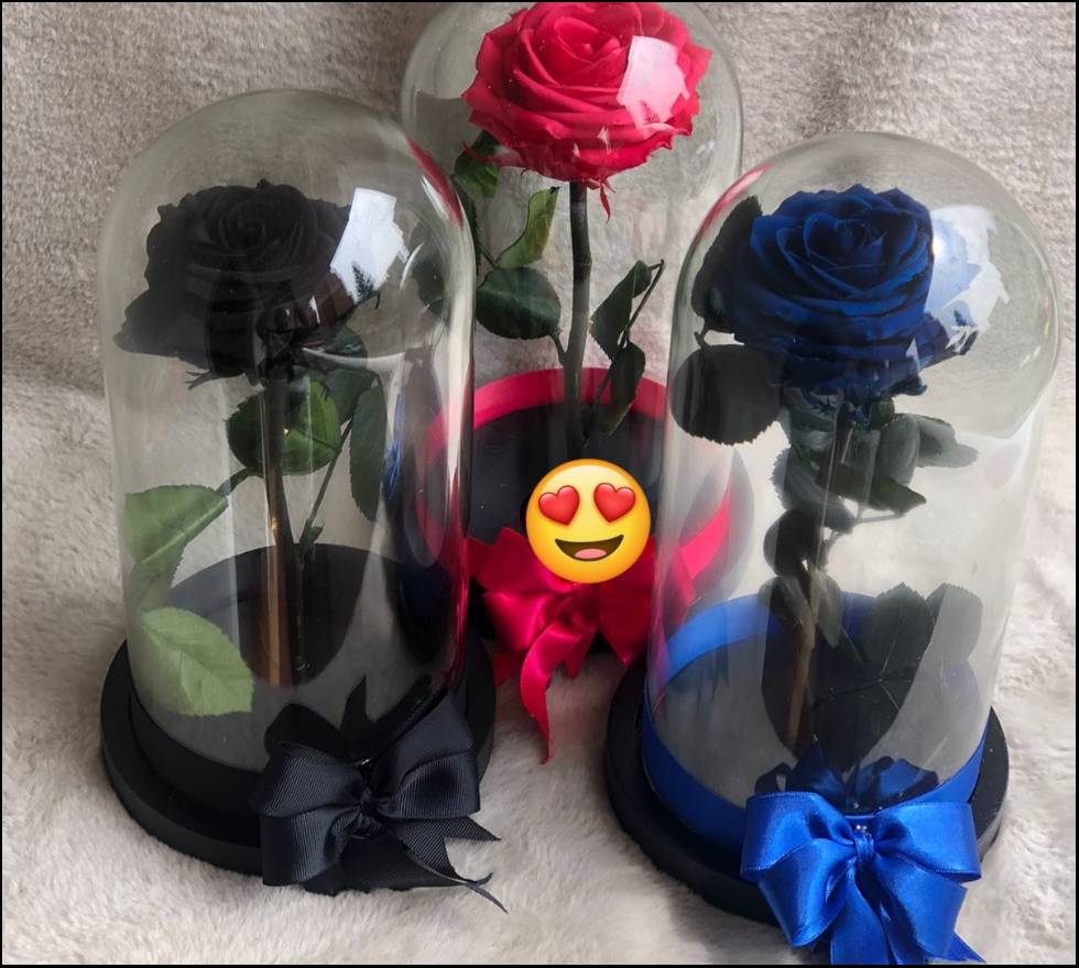 Haz de tu regalo algo verdaderamente único con este impresionante arreglo de rosas preservadas en tonos rojo, azul y negro, que han sido cuidadosamente tratadas para mantener su belleza natural durante más de 2 años. Cada rosa es una obra de arte inmortalizada, combinando el simbolismo de la rosa roja (amor y pasión), la rosa azul (misterio y serenidad) y la rosa negra (elegancia y seguridad), creando una composición llena de significado y emoción.