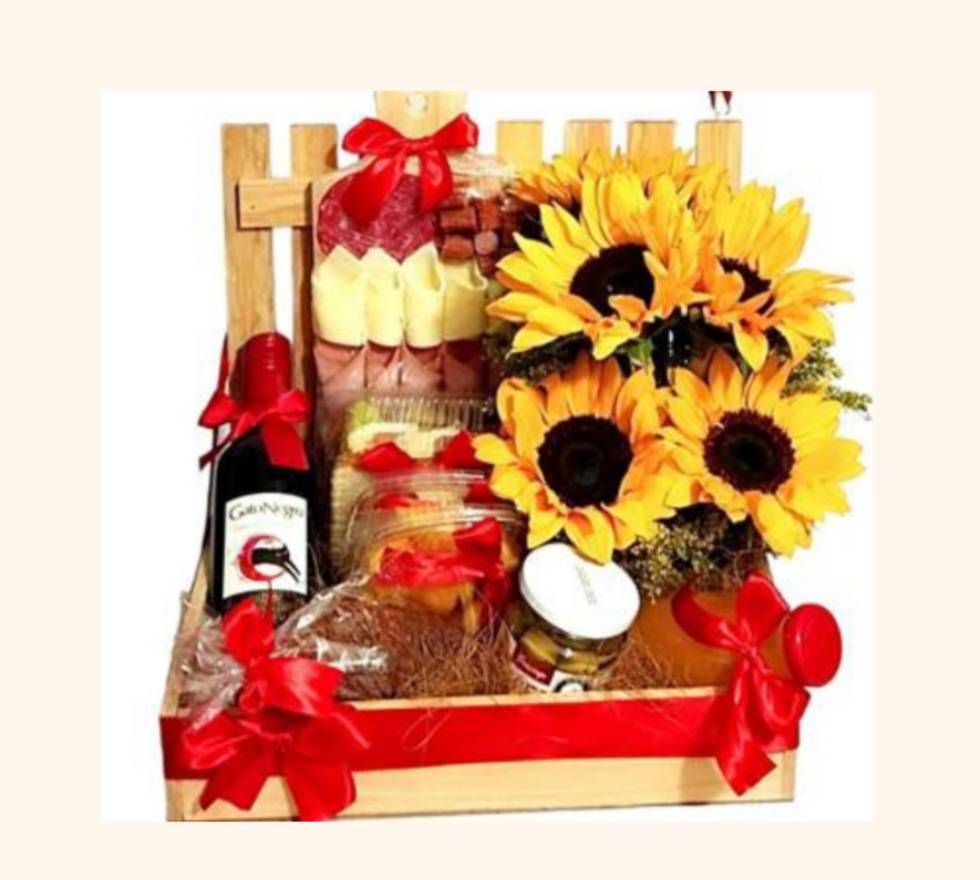 Caja de madera en forma de baúl, cinta decorativa, tarjeta, globo, 5 girasoles con follaje natural, fibra de coco decorativa, tabla de maduros y quesos, media botella de vino Gato Negro vino tinto, sandwich, fruta picada, croissant relleno de nutella cubierto de chocolate, rollos de tortilla con (jamón, lonchita y lechuga), aceitunas y jugo de naranja.
