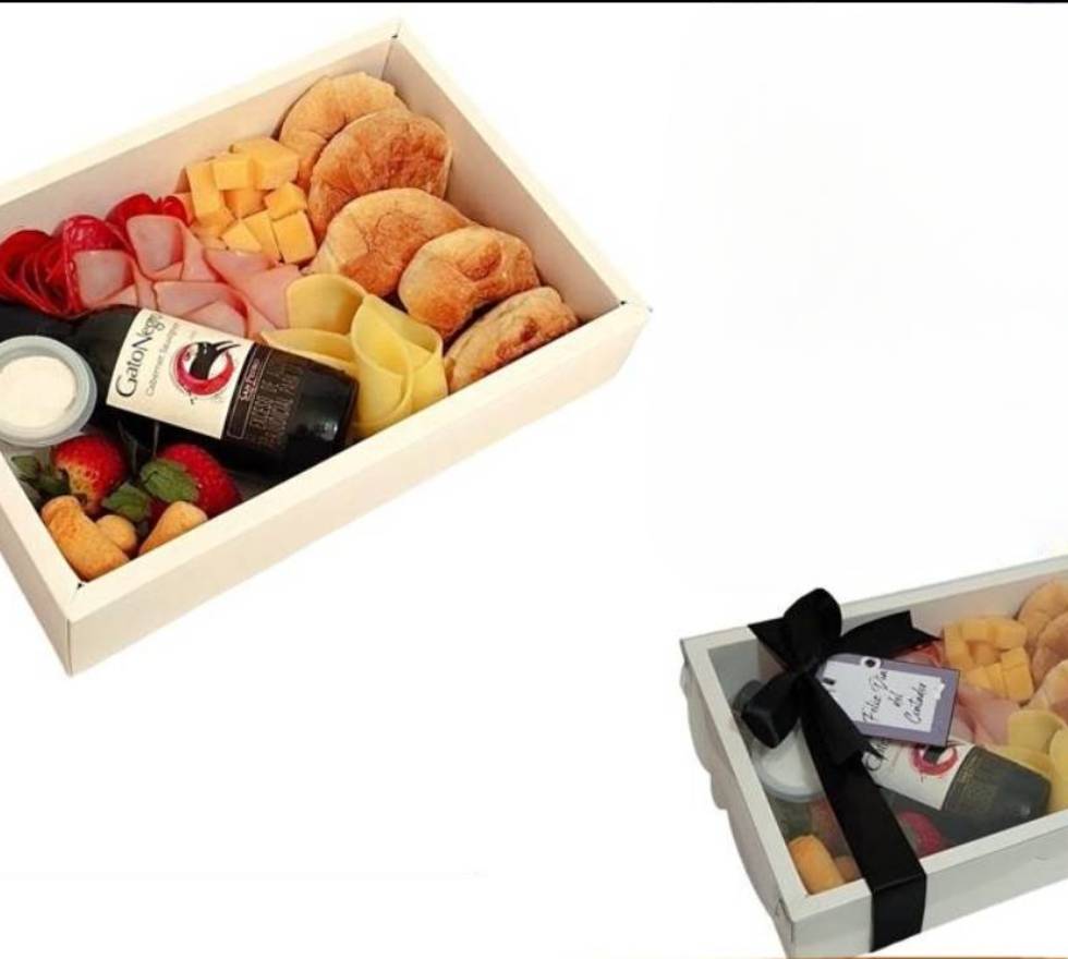 Caja de cartón con tapa en acetato, cinta decorativa, tarjeta, 5 croissant pequeños, dip queso, queso en cuadros, queso en rollos, salami, chorizo vela, jamón, piba de vino gato negro tinto, fresas y achiras.