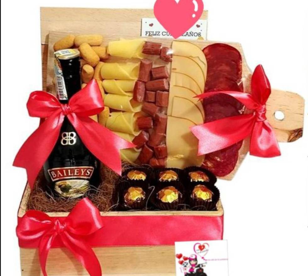 Caja de madera en forma de baúl, cinta decorativa, tarjeta, fibra de coco decorativa, media de botella de baileys (se puede cambiar el licor, varia el valor), tabla de madera con quesos y carnes maduradas (pueden variar según disponibilidad) y 6 trufas de brownie.