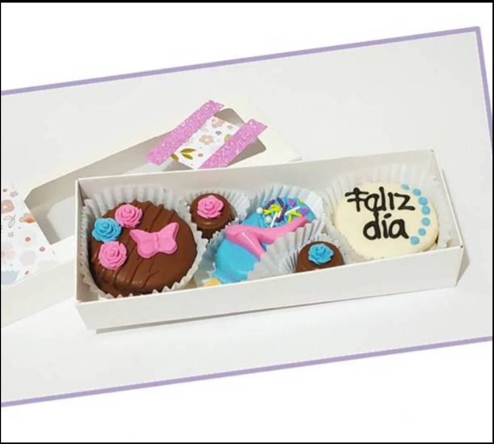 Caja de carton con tapa en acetato, 2 galletas de mantequilla rellenas de nutella y maní cubiertas de chocolate personalizadas, 2 bombones de chocolate y una paleta de chocolate decorada.