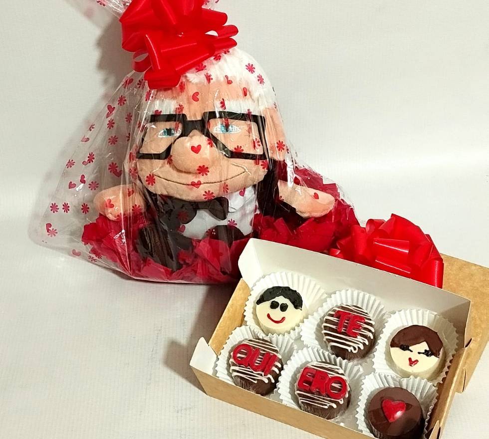 Caja de cartón kraft, moño, tarjeta, 6 trufas de brownie cubiertas de chocolate café personalizadas y peluche según disponibilidad.