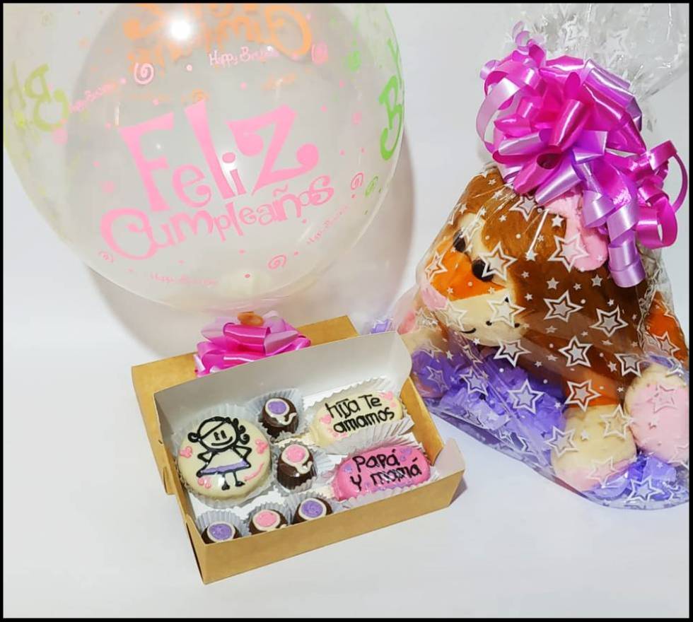 Caja de cartón kraft, moño, globo, tarjeta, 1 galleta de mantequilla rellena de nutella y maní cubierta de chocolate personalizada, 5 bombones de chocolate con relleno surtido, 2 paletas de chocolate con relleno y 1 peluche según disponibilidad con empaque.