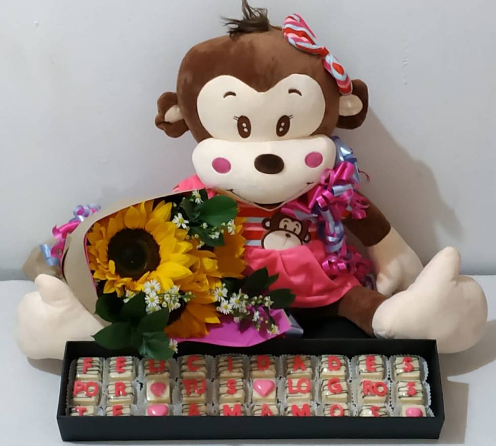 Caja de cartón, moño, tarjeta, 30 bombones de de chocolate con texto personalizado, bouquet de 3 girasoles con follaje y peluche según disponibilidad.