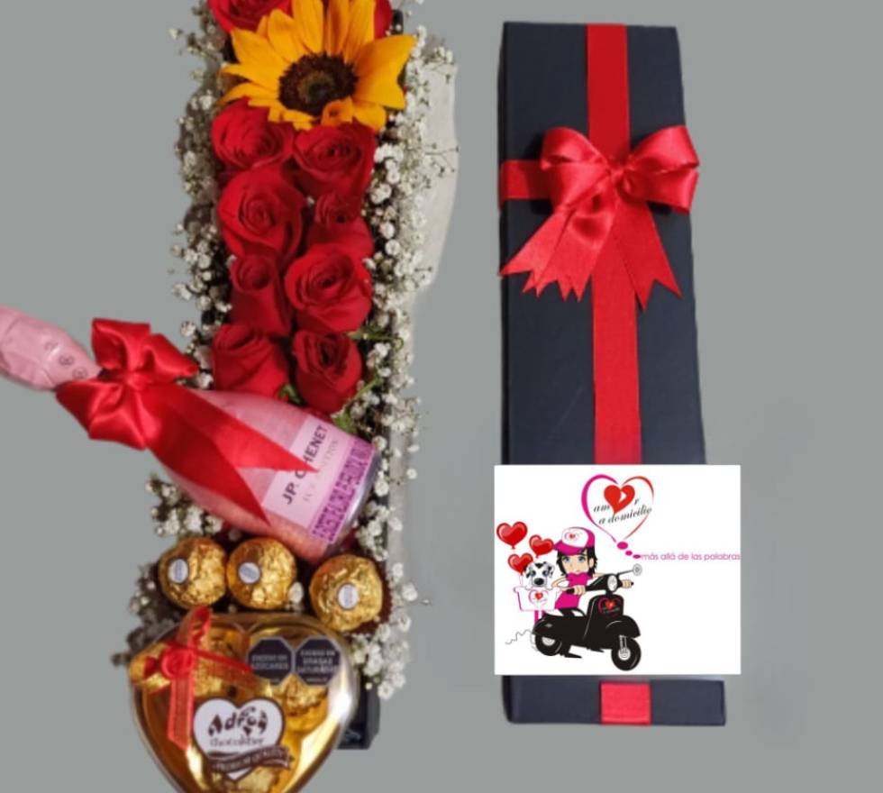 Haz de cualquier ocasión especial un momento inolvidable con esta exquisita caja de rosas rojas, acompañada de una media botella de JP Chenet, un girasol radiante y una deliciosa caja de chocolates Ferrero. La caja de rosas rojas simboliza el amor eterno, mientras que el girasol aporta un toque de alegría y calidez. Juntos, estos elementos crean una combinación perfecta de romanticismo y frescura.