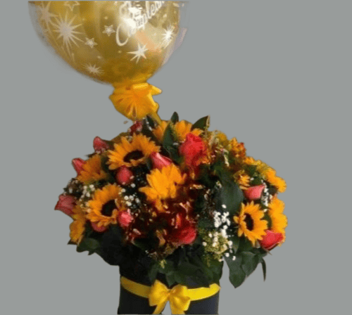 Sorprende a esa persona especial con una caja en forma redonda con rosas y girasoles, una combinación perfecta de elegancia y frescura. Esta caja redonda, cuidadosamente diseñada, contiene una mezcla armoniosa de rosas elegantes y girasoles radiantes. Las rosas aportan un toque romántico y sofisticado, mientras que los girasoles llenan el regalo de energía positiva y luminosidad, creando una presentación impactante y llena de color.