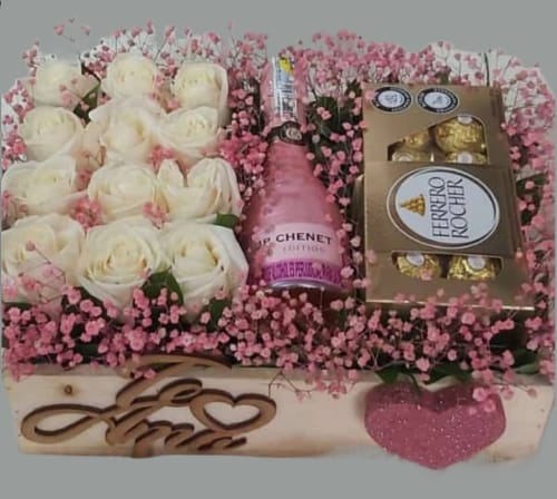 "Un regalo sofisticado y lleno de elegancia, nuestra caja de madera contiene 12 hermosas rosas blancas frescas, acompañadas de una media botella de JP Chenet rosado y una caja con 8 deliciosos chocolates Ferrero. Las rosas blancas, símbolo de pureza y amor eterno, son la base perfecta para este obsequio que evoca elegancia y buen gusto. El vino rosado JP Chenet aporta un toque de distinción y sabor, ideal para brindar en cualquier ocasión especial. Además, la caja de 8 chocolates ferrero, con su envoltura dorada, agrega un toque de dulzura y lujo. Este conjunto es perfecto para aniversarios, celebraciones o como un detalle romántico y exclusivo para esa persona especial."