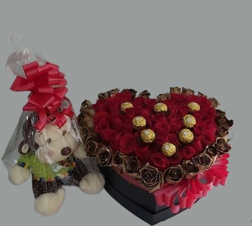 Caja de Rosas en Forma de Corazón con Peluche y Chocolates Ferrero