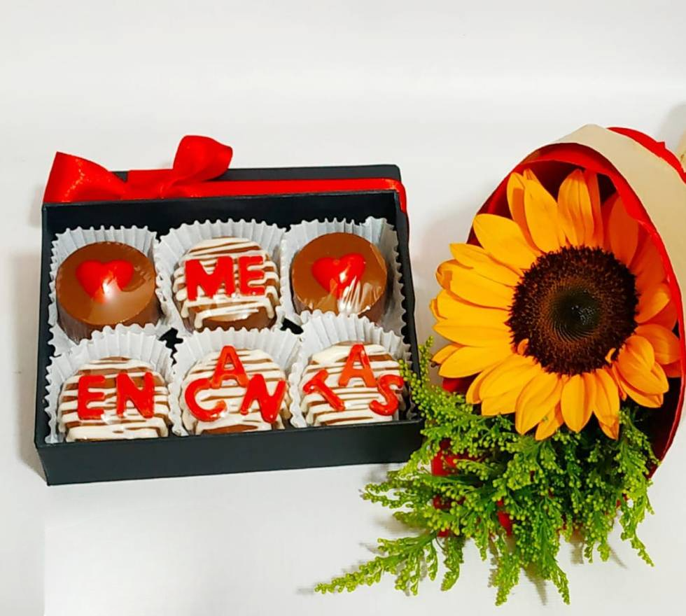 Caja de cartón procesado, cinta decorativa, tarjeta, 6 trufas de brownie personalizados y un bouquet con girasol y follaje.