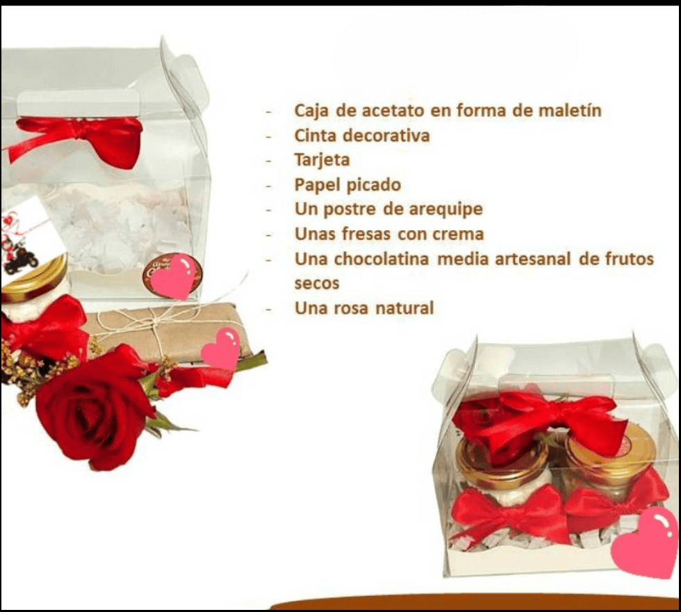 Caja de acetato en forma de maletín, cinta decorativa, tarjeta, papel picado, un postre de arequipe, unas fresas con crema, una chocolatina media artesanal de frutos secos y una rosa natural.
