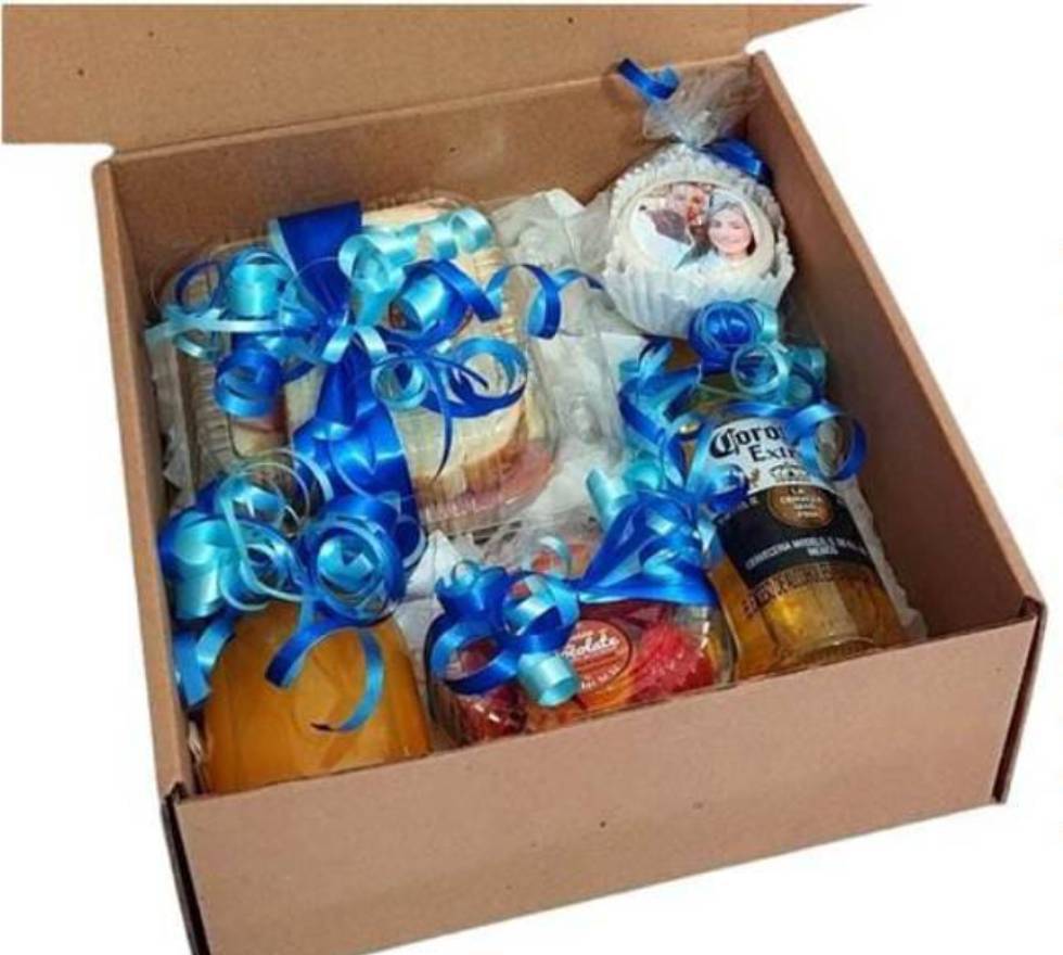 Caja de cartón, cinta decorativa, tarjeta, papel picado, una galleta de mantequilla rellena de Nutella y maní cubierta de chocolate personalizada, una cerveza Coronita, sándwich, jugo de naranja y fruta picada.