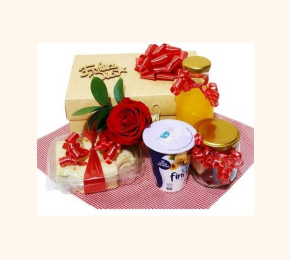 Caja de cartón kraft, cinta decorativa, tarjeta, pin de madera, mantel, rosa natural con follaje, jugo de naranja, fruta picada, yogurt finesse y rollos de tortilla con (jamón, lonchita, lechuga y mostaneza).